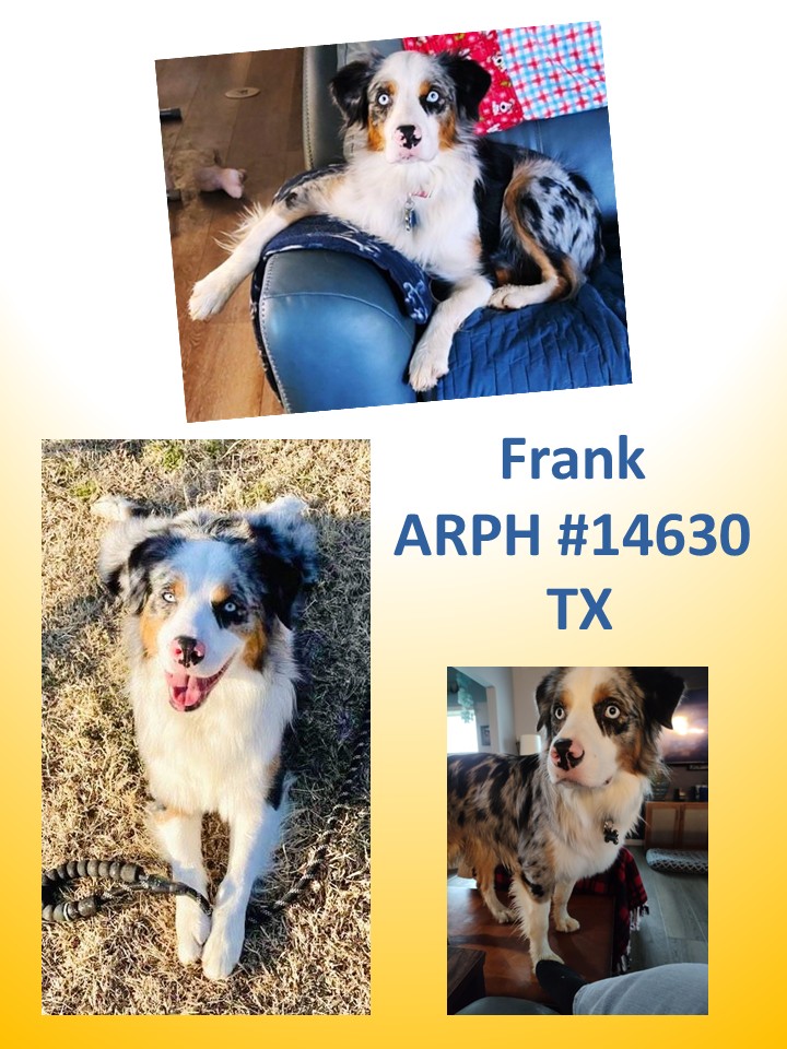 Frank is an ~1.5-2yo, 50lb, fully-vetted male Australian Shepherd that came to us from a very full shelter after being picked up as a stray.